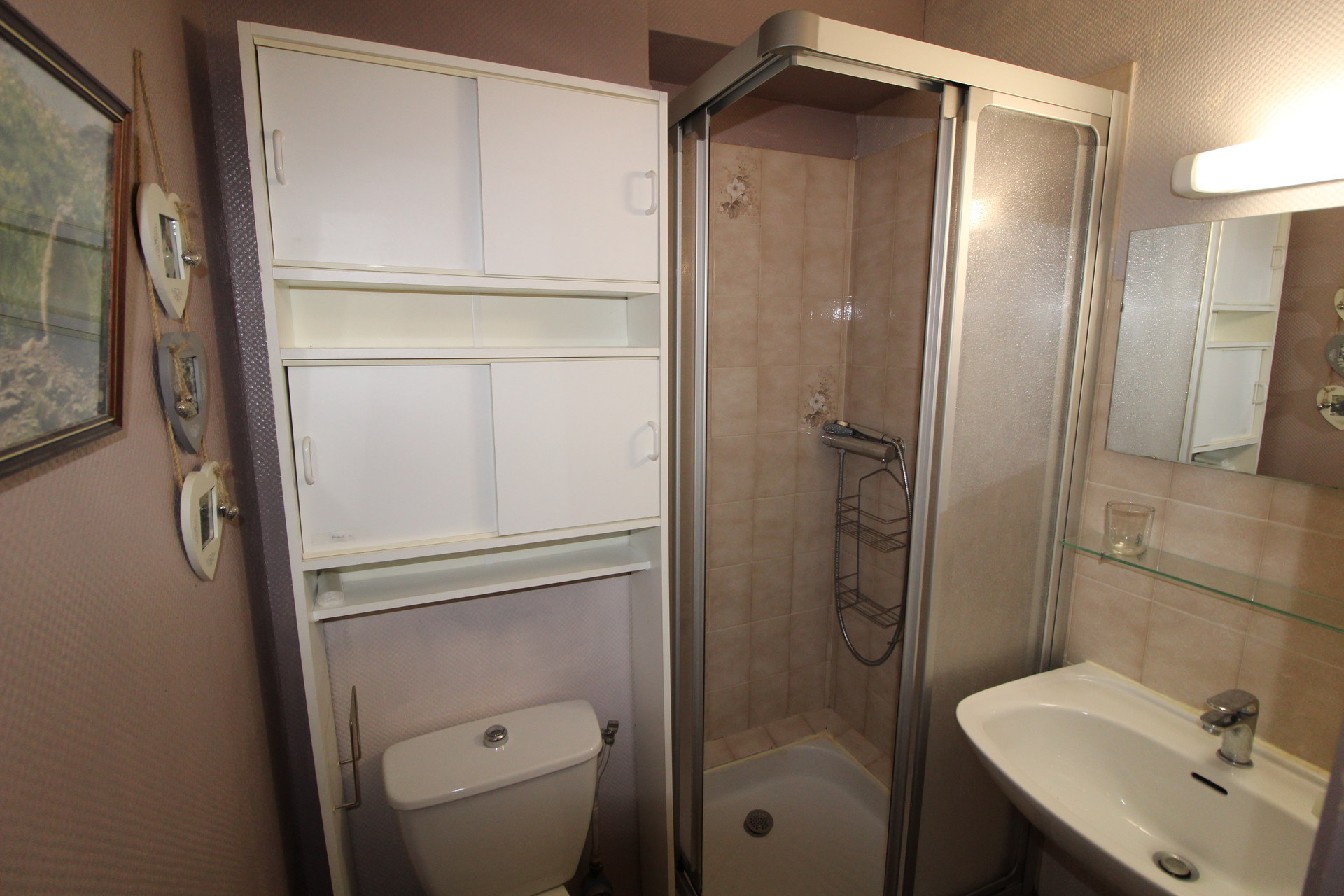 Bathroom: shower, sink, and toilet