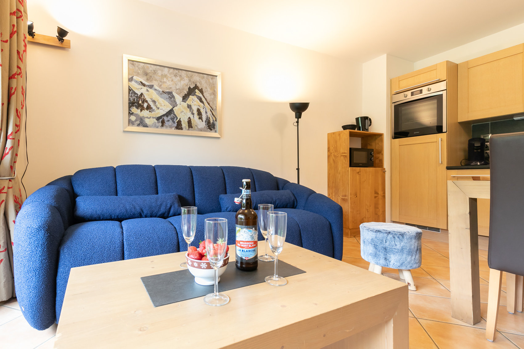 Séjour avec cuisine équipée : réfrigérateur, plaques vitrocéramiques, four , lave vaisselle, micro-ondes.