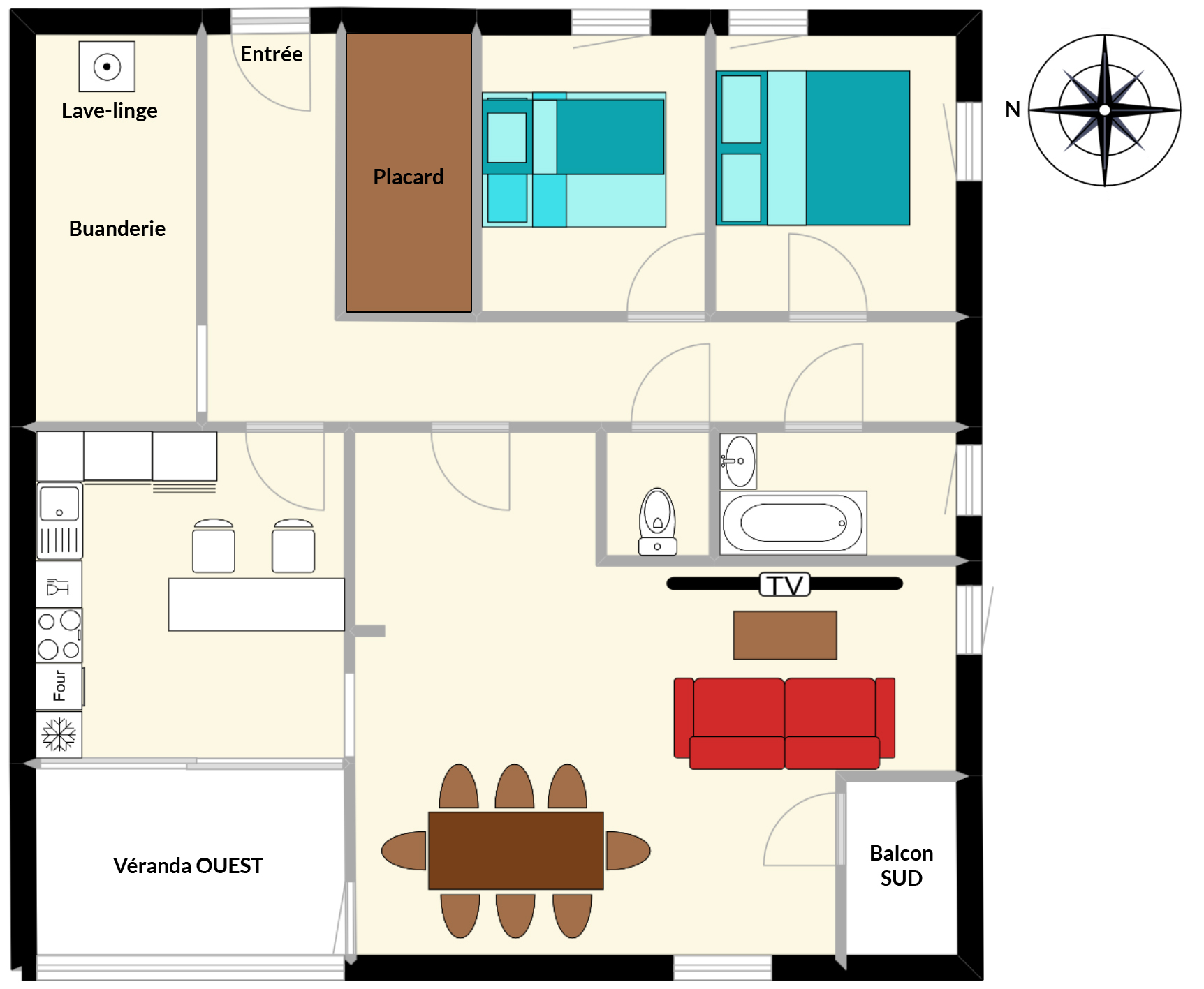Fully equipped kitchen: oven, microwave, dishwasher, hotplates, fridge, opening onto a beautiful west-facing veranda.